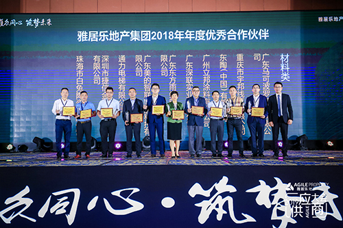 5月13日,雅居樂地產(chǎn)集團(tuán)2019年供應(yīng)商大會(huì)在廣州東方賓館會(huì)議中心召開,會(huì)上發(fā)布“2018年度優(yōu)秀供應(yīng)商名錄”,東方雨虹憑借優(yōu)質(zhì)的產(chǎn)品與服務(wù)榮獲雅居樂地產(chǎn)集團(tuán)材料類“2018年優(yōu)秀合作伙伴”。東方雨虹工程建材集團(tuán)總裁張志萍出席領(lǐng)獎(jiǎng)。