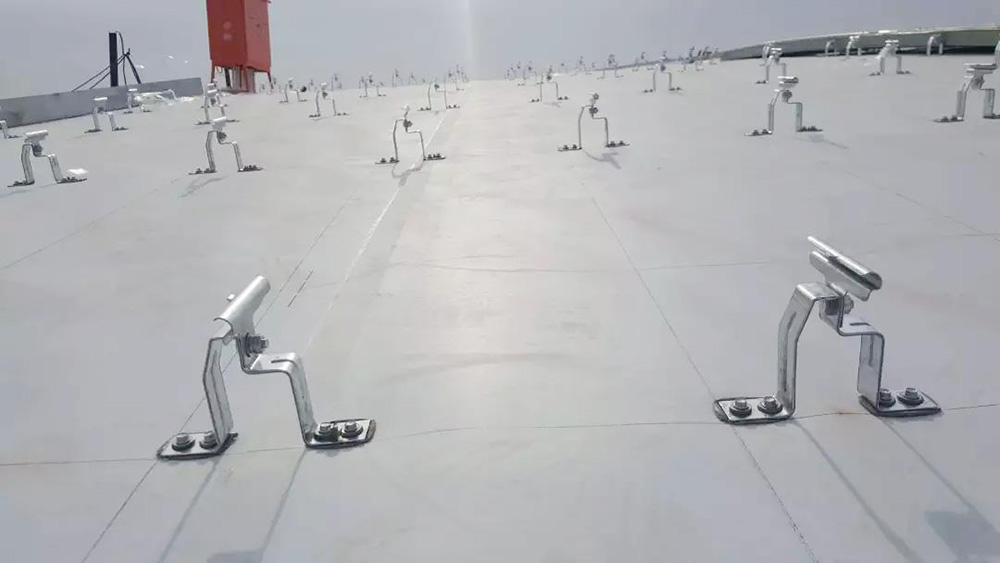 該項目屋面防水等級為一級,在屋面圍護系統中,指廊部分采用1.5mm織物內增強型TPO防水卷材設置于鍍鋅鋼板與巖面保溫層間,通過鍍鋅鋼支座機械固定于幾字形檁條,搭接邊采用熱風焊接工藝。核心區與指廊區采光帶間、采光帶與屋面間通過天溝進行分隔,天溝部分采用2.0mm織物內增強型TPO防水卷材,防水層采用底部無穿孔固定+天溝側壁滿粘的工法,防水層完成后卷材直接外露使用。